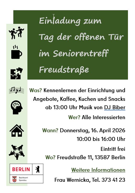 Der Seniorentreff Freudstraße, eine Einrichtung des Bezirksamtes Spandau – Amt für Soziales, Fachbereich Seniorinnen und Senioren – lädt am Donnerstag, den 16. April 2026, von 10:00 bis 16:00 Uhr, herzlich zum Tag der offenen Tür ein.