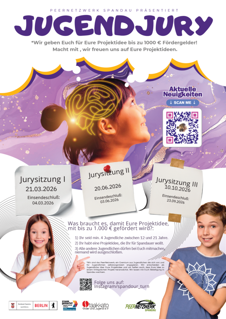 Um an der Jugendjury teilzunehmen, muss sich eine Gruppe aus mindestens vier Jugendlichen zwischen 12 und 21 Jahren finden. Die eingereichten Projekte sollen auch jungen Menschen aus anderen Bezirken zugutekommen. Für die Jugendjury stellen das Programm „Stark gemacht! – Jugend nimmt Einfluss“ des Jugend-Demokratiefonds Berlin und das Bezirksamt Spandau auch 2026 Mittel zur Verfügung. Über die Verwendung der Mittel entscheiden die antragsstellenden Jugendlichen selbst. Die Jugendjury Spandau wird von Staakkato e.V. koordiniert. Als Projektpaten und fachliche Begleitung stehen den Teilnehmerinnen und -teilnehmern Mitglieder der Spandauer JugendBeteiligungsRunde und des Peer-Netzwerks Spandau zur Seite.