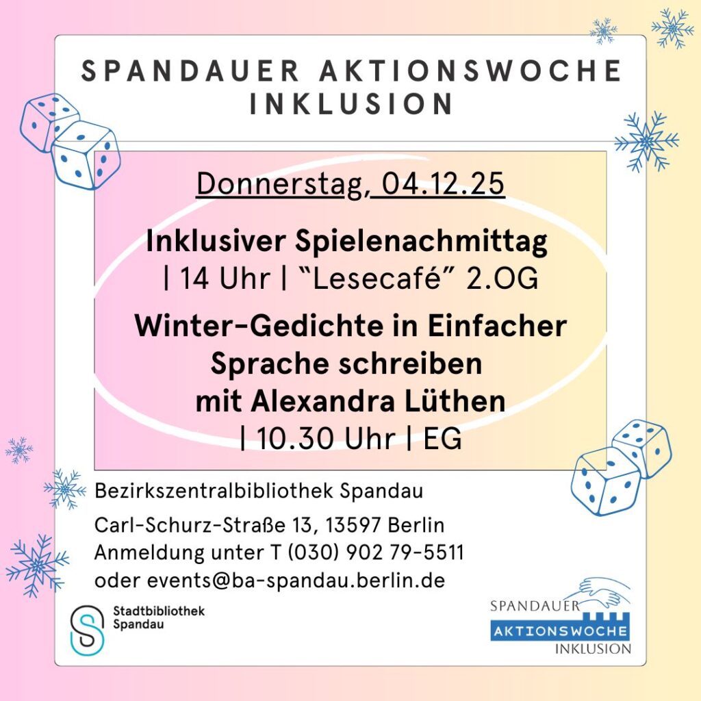 Wir starten mit der Spandauer Aktionswoche Inklusion in den Dezember, gefolgt von einem zauberhaften Adventsprogramm für Groß und Klein.