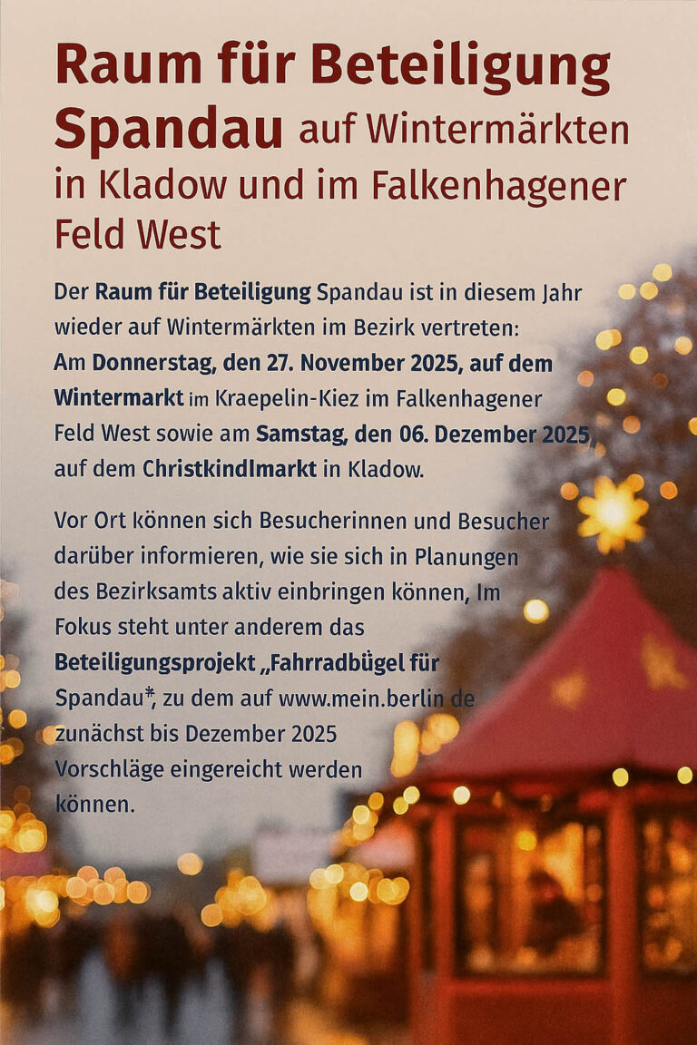 Der Raum für Beteiligung Spandau ist in diesem Jahr wieder auf Wintermärkten im Bezirk vertreten: Am Donnerstag, dem 27. November 2025, auf dem Wintermarkt im Kraepelin-Kiez im Falkenhagener Feld West sowie am Samstag, dem 06. Dezember 2025, auf dem Christkindlmarkt…