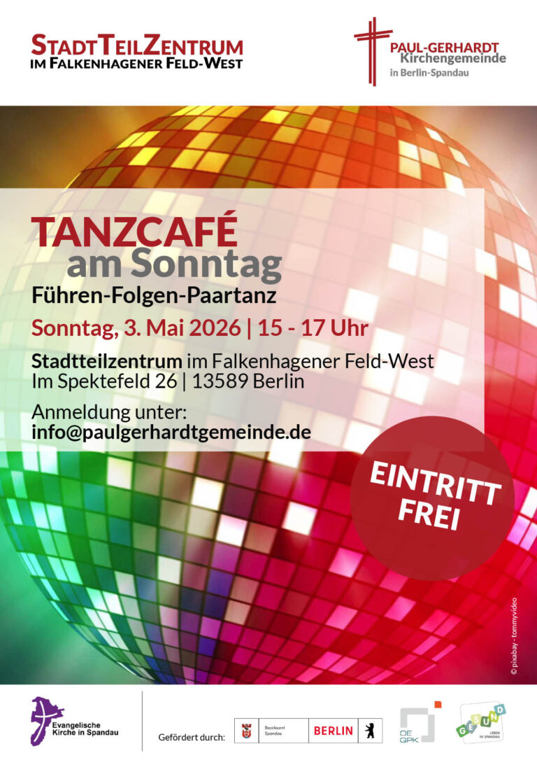 Am 03.05.2026 um 15.00 Uhr laden wir herzlich zu unserem ersten Tanzcafé in Paule ein. Jeder und Jede ist willkommen, Anmeldung bitte an info@paulgerhardtgemeinde.de oder unter 030-322944-520.