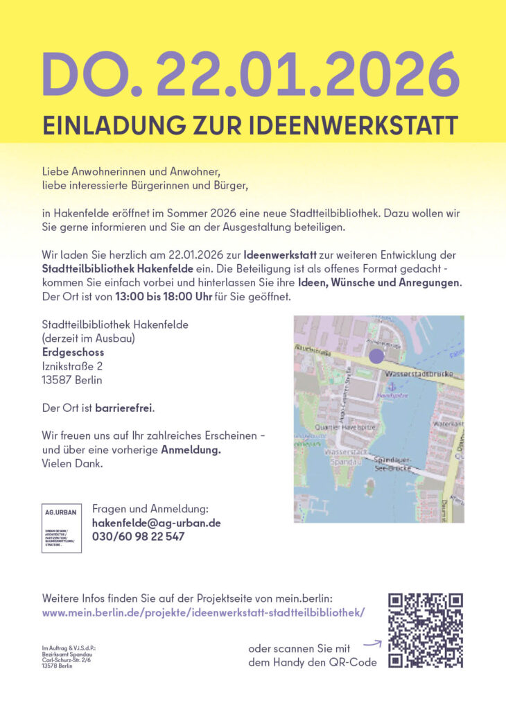n Hakenfelde eröffnet im Sommer 2026 eine neue Stadtteilbibliothek. Dazu wollen wir Sie gerne informieren und Sie an der Ausgestaltung beteiligen.