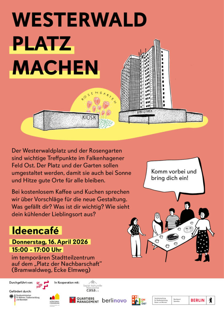 Ideencafé: Donnerstag, 16. April 2026, 15:00 – 17:00 Uhr im temporären Stadtteilzentrum auf dem „Platz der Nachbarschaf“(Bramwaldweg, Ecke Elmweg)